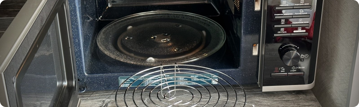 Гриль — это встроенный нагревательный элемент, расположенный в верхней части камеры. Во время работы он излучает тепло, которое воздействует на продукт снаружи. В зависимости от модели микроволновки гриль может быть кварцевым или тэновым. Кварцевый работает быстрее и потребляет меньше энергии, но требует аккуратного ухода.