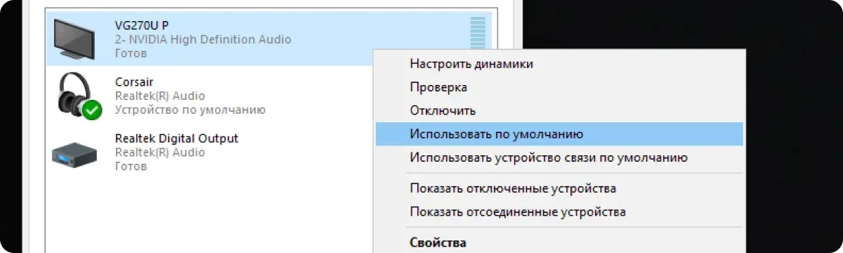 Если звук не идет через монитор, возможно, система выбрала другой источник вывода. Чтобы изменить это: