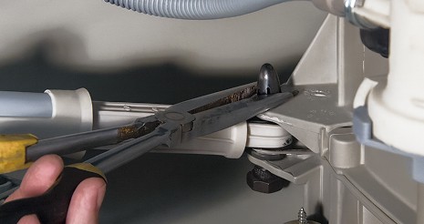 Перед началом ремонта мастер отключает технику от сети и водопровода. Затем снимает заднюю крышку корпуса и осматривает оба амортизатора. В большинстве моделей стиралок Самсунг они крепятся к баку и основанию корпуса с помощью металлических фиксаторов или болтов.